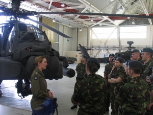 Upon arrival at the home of the Army Air Corps at Middle Wallop we started with a tour of the Museum of Army Aviation given by the curator, Colonel Patterson. He explained how the Army has in fact been flying longer than either the Navy or the RAF having started with balloons and kites to spy on the enemy. Col Patterson went on to show the cadets how aircraft types had progressed within the Army; they saw how huge gliders carried tanks in the Second World War and why small planes were used as air taxis. Rounding off with the helicopters with which the Army Air Corps (AAC) has become associated with today and describing how they have developed into front line fighting machines.