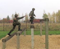 At 08.00 hours the Cadets assembled at the Defence Intelligence and Security Centre at Chicksands, Bedfordshire where they tackled the Army’s arduous Confidence Course. In somewhat foggy conditions and under the supervision of a trained army Physical Training Instructor the Cadets negotiated rope swings, monkey bars and brick walls in timed individual and team races.