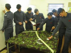 Meanwhile back inside AWO Browne had prepared the classroom for the next lesson which was titled ‘managing your assets’, where the interest grabber included a excerpt from an episode of ‘Dads Army’ which was used to illustrate how not to do it. The lesson was put together to open the course to the theory of dealing with multiple problems in the most efficient manner. After another short break and a move to the adjacent classroom there was a table top exercise to tackle. The cadets found a model map set out with a team of 10 model soldiers, each with a designated trade or skill, the exercise, entitled Ex War Room saw injects fed to the students. With the clock ticking the team had to decided how best to deal with various situations including searching for a downed pilot behind enemy lines and mounting security patrols.