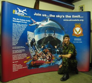 Taken at 10,000 above the Irish Sea whilst flying in a 208 Squadron Hawk aircraft from RAF Valley, the stunning picture of Cadet Warrant Officer Croft shows him during his Cadet Of The Year Flight and forms the centre piece of the recruiting stand.
