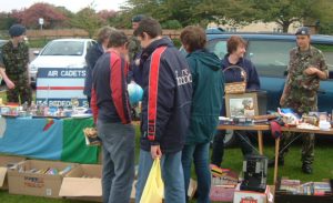 By 0715hrs on Sunday morning we were in the queue to set up at Elstow playing fields, the gate opened and as soon as the cars stopped people were looking at what we had to sell. The first sale of the day was quite fittingly an aircraft model! Cadets Pickering and Gilbert put their Knots and Lashings skills into use by creating a temporary clothing rail to display some of the items available.