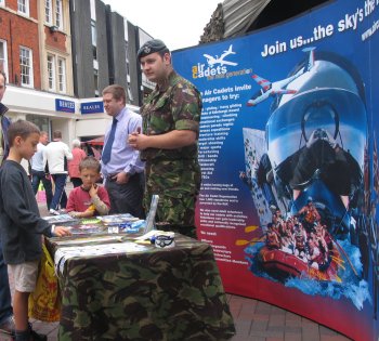 With a prime location secured on the busy crossroads of Bedford's pedestrianised centre, the Cadets set up base using one of their tents to act as their hub for the day. Here visitors who had been canvassed by cadets with flyers for the open day could talk directly to cadets and staff about life as a member of the UK's premier youth organisation. Many visitors were surprised at the sheer variety of activities open to the next generation. With a number of interested parties travelling in for a day's shopping, the team were also able to offer advice on approaching alternative squadrons for those who were not local to Bedford, including prospective members of neighbouring areas such as Hertfordshire & Buckinghamshire and South & East Midlands Wings.