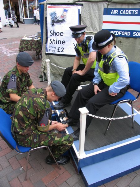 Polish on, polish off was the order of the day when industrious Air Cadets from 134 (Bedford) Squadron set up a shoeshine stand in the centre of Bedford Town Centre. Continuing their efforts to raise funds for the unit's minibus fund the cadets set up a two seat shoeshine stand and for £2 a pair the public were invited to have their shoes cleaned by the professionals. The stand was well attended and running alongside the Squadron's recruiting stand acted as an interest grabber prompting the public to take an interest in the Air Cadets. At the end of what was a busy and, at times, wet day the squadron added another £100 to its growing minibus fund, which now totals £19,500. Warrant Officer Taylor said, “When raising funds
