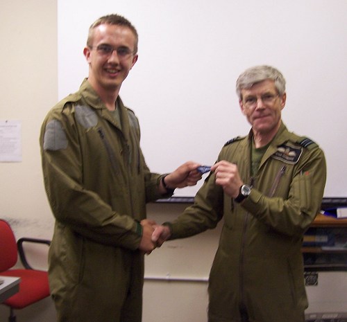 On Sunday 27th April having completed 9hrs 40mins flying time he undertook his pre solo and then his solo flight which enabled him to receive the prestigious Silver Wings award from Flt Lt P Harborne.