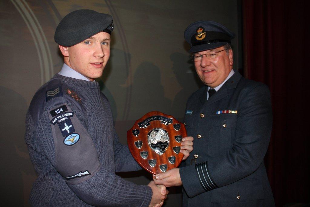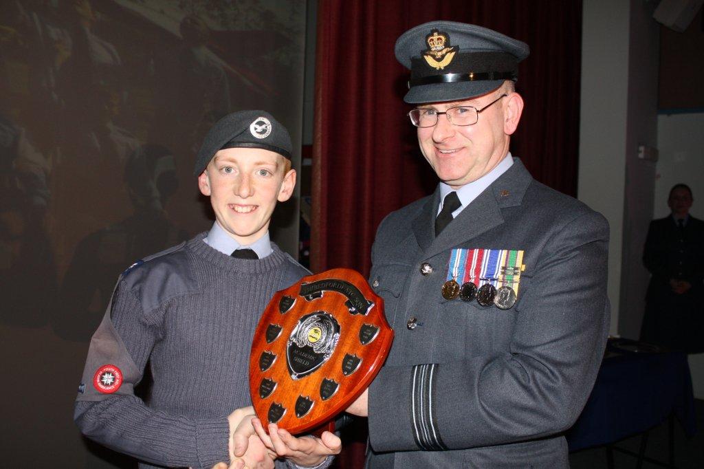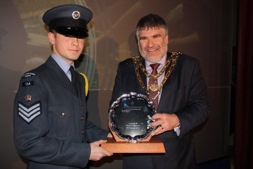 Next was the turn of the Mayor of Bedford, Dave Hodgeson to award the Leadership Trophy to FS Jonathon Bell. Jonathon had led the Squadron Drill team through the Wing and regional competitions. He had previously received the Regional Drill best NCO, and also led the winning flight at Easter camp.
