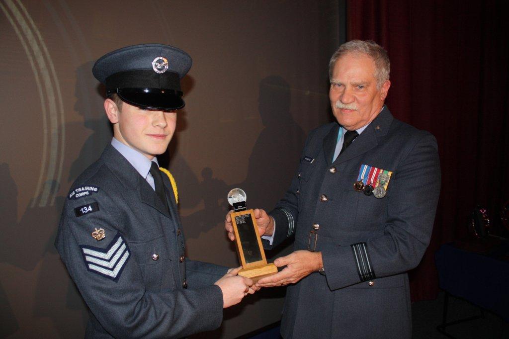 The final and most coveted award of the evening was the Squadron Cadet Of The Year, presented by Lt Col Peebles. A nervous hush filled the room as the gold envelope was opened to reveal the winner - Sgt Luke Denham who has impressed the staff team with his continued hard work in the Squadron.