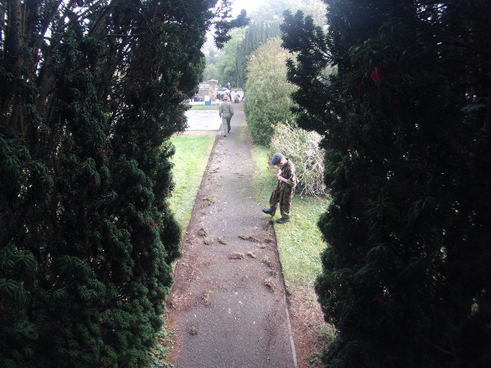 After a well deserved lunch break the cadets continued with the task in hand, the path leading up to and surrounding the war memorial was cleaned and the overgrowing grass was neatly cut back. A bramble bush which had overgrown one of the yew trees was also pruned.