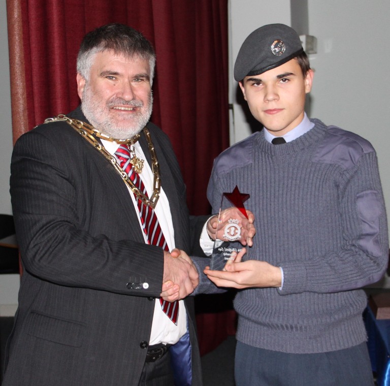 Cdt Kieran Allgar being presented the Citizenship Award by Bedford Mayor Dave Hodgson